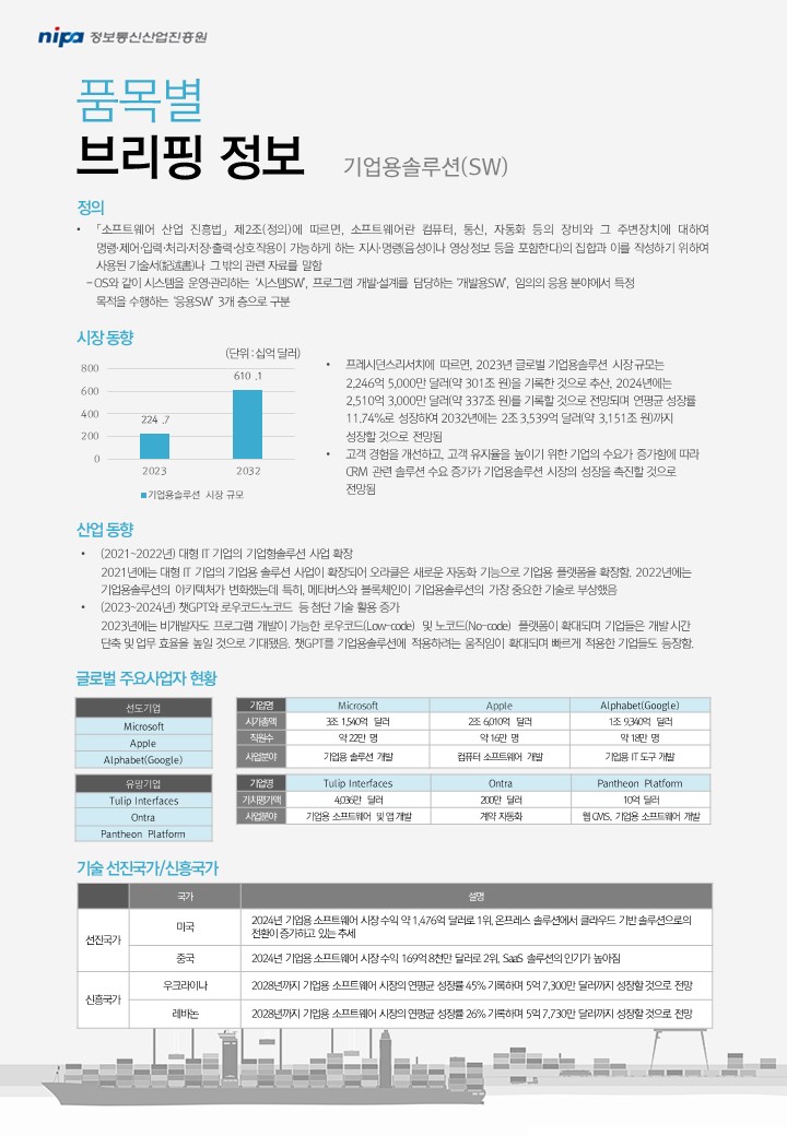 ▪ 2022년 글로벌 기업용솔루션 시장 규모는 2,010억 5,000만 달러(약 269조 원)를 기록하였으며, 2023년에는 2,246억 5,000만 달러(약 301조 원), 2024년에는 2,510억 3,000만 달러(약 337조 원)를 기록할 것으로 예상됨