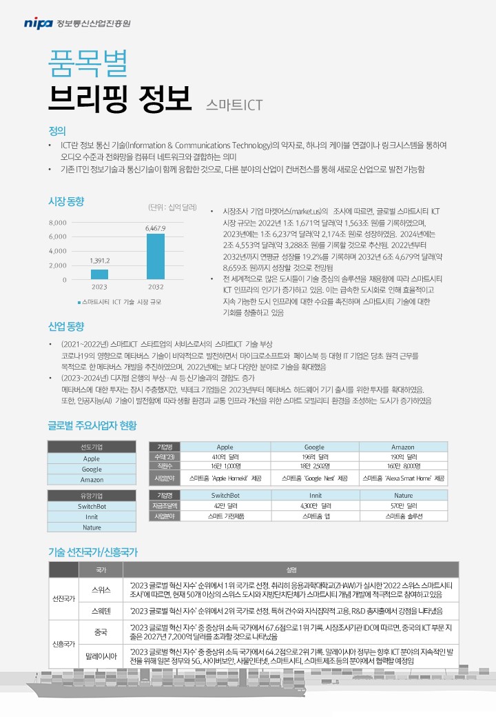 ▪ 시장조사 기업 마켓어스(market.us)의 조사에 따르면, 글로벌 스마트시티 ICT 시장 규모는 2022년 1조 1,671억 달러(약 1,563조 원)를 기록하였으며, 2023년에는 1조 6,237억 달러(약 2,174조 원)로 성장하였음. 2024년에는 2조 4,553억 달러(약 3,288조 원)를 기록할 것으로 추산됨. 2022년부터 2032년까지 연평균 성장률 19.2%를 기록하며 2032년 6조 4,679억 달러(약 8,659조 원)까지 성장할 것으로 전망됨